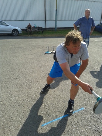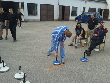 Další pokračování Východočeského turné proběhlo v Jaroměři. Za slunečného počasí dorazilo na místní ČOV i hostující družstvo Českoskalických vodáren. A mohlo se začít metat. Zatím co se na rožni otáčela kýta, družstva si to rozdala každý s každým. Vzhledem k jejich hravosti jsme stihly hned tři otáčky. Opět nechybělo vzájemné hecování. Zvlášť když hráč posledním hodem poslal do vítězství soupeře… To pak bylo hodně bouřlivo. No nic, hlavně že jsme se bavili – a že nám to šlo. Po soutěži přišel nápad, že si to rozdají jednotlivci v přesnosti hodu na puk. Jen jednomu jedinci se povedlo umístit kámen na doraz k puku. Ale i 3 a 4,5 cm byl velice slušný výkon. Nakonec jsme ještě v příjemné pohodě poseděli a tak jsem měl honičku stihnout druhý fotbal…